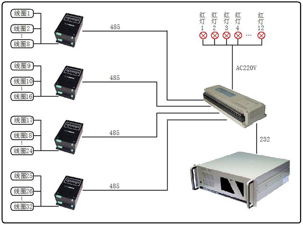 集中控制器提供四個獨立485接口,互不干擾,每個檢測器采用485線與集中控制器連接;