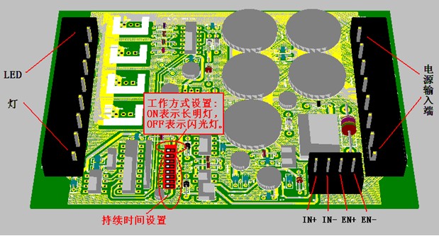撥碼快關(guān)設(shè)置:1=ON表示長(zhǎng)明燈,1=OFF表示閃光燈;